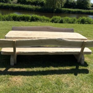 Buitengewoon robuuste set van twee banken en een tafel. Het tafelblad en de zittingen zijn gemaakt van 12,5 cm. dikke delen. Zowel in Eiken als in Douglas uitgevoerd is de set even degelijk als het forse aanzicht doet vermoeden. De zit is verrassend comfortabel door de uitgekiende hoek van de rugleuning met de zitting.